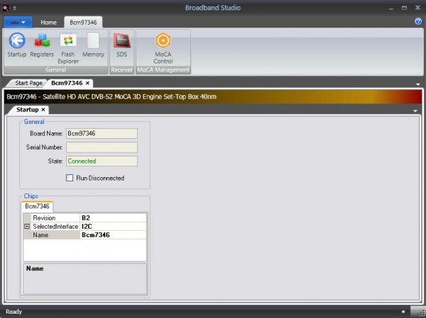 4. Start up the Broadband Studio 3 software, Turn On the receiver, Switch on the development board, and when all is correct, you should see the connection to the Bcm97346 cpu